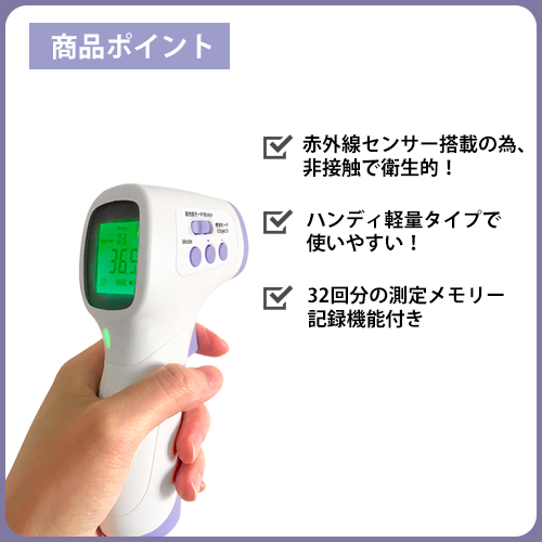 “ハンディタイプで使いやすい非接触式温度計です。赤外線センサー搭載。約1秒のスピード測定、測定結果は32回分 を自動で保存が可能です。